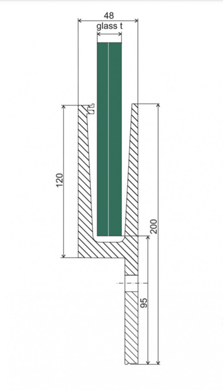 Сборка и установка: Профиль крепится через отверстия просверленные в боковой части профиля. Стекло вставляется сверху, зажимается распорными клиньями через уплотнительные резиновые прокладки. монтажный паз профиля закрывается резиновой накладкой. Сбоку профиль закрывается торцевой заглушкой (из нержавеющей стали)