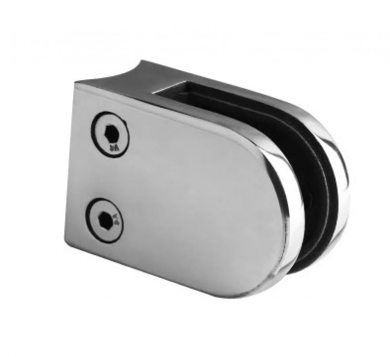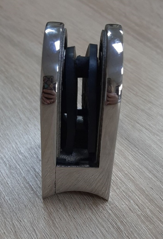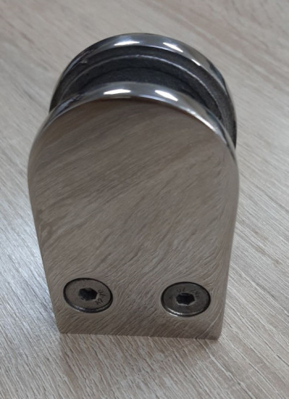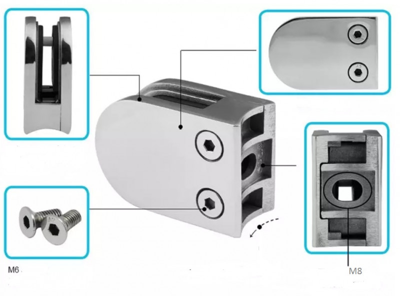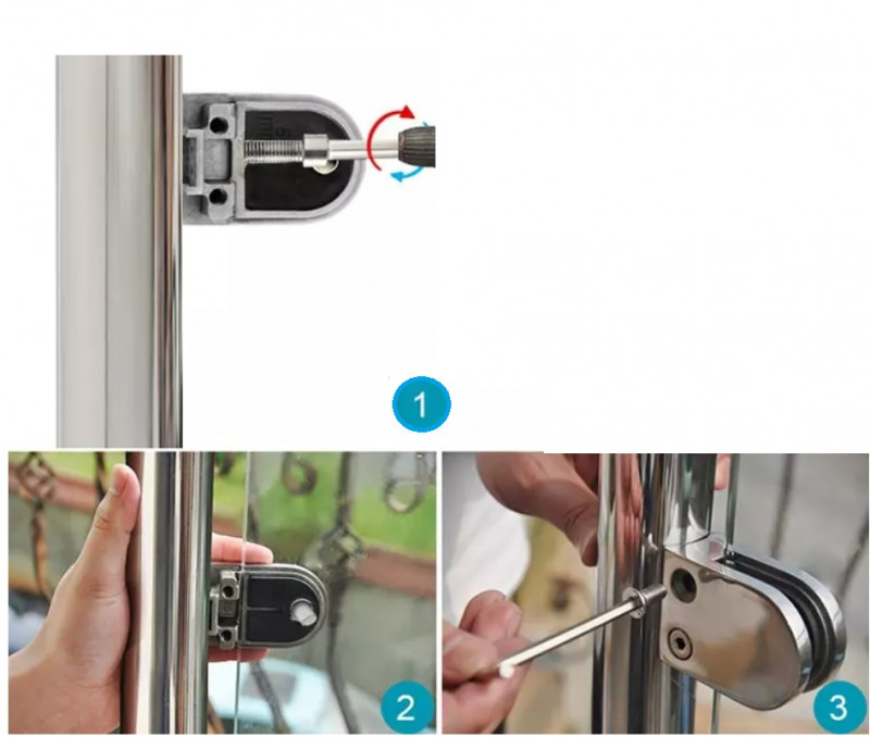 1. Стеклодержатель делим на две части, выкрутив шестигранники. В стойке выполняем отверстие для вытяжной резьбовой заклепки под винт для монтажа кронштейна. Закрепляем деталь стеклодержателя, которая является несущей, к стойке внутрь посредством винта или самореза из нержавейки. Стекло закрепляется посредством установки второй части кронштейна.
