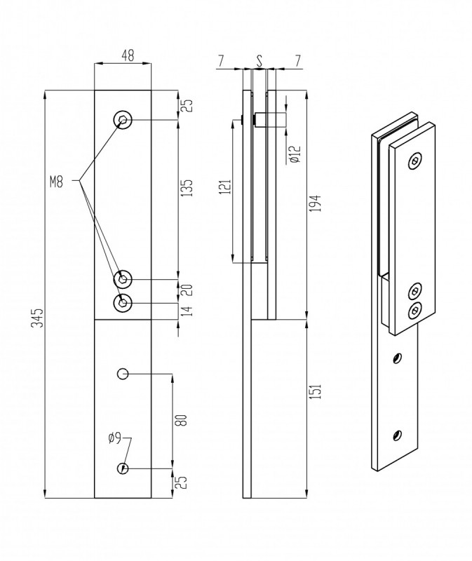 Стеклодержатель Inoxstore зажимной 48х347мм, боковое крепление, сатинированный AISI 304