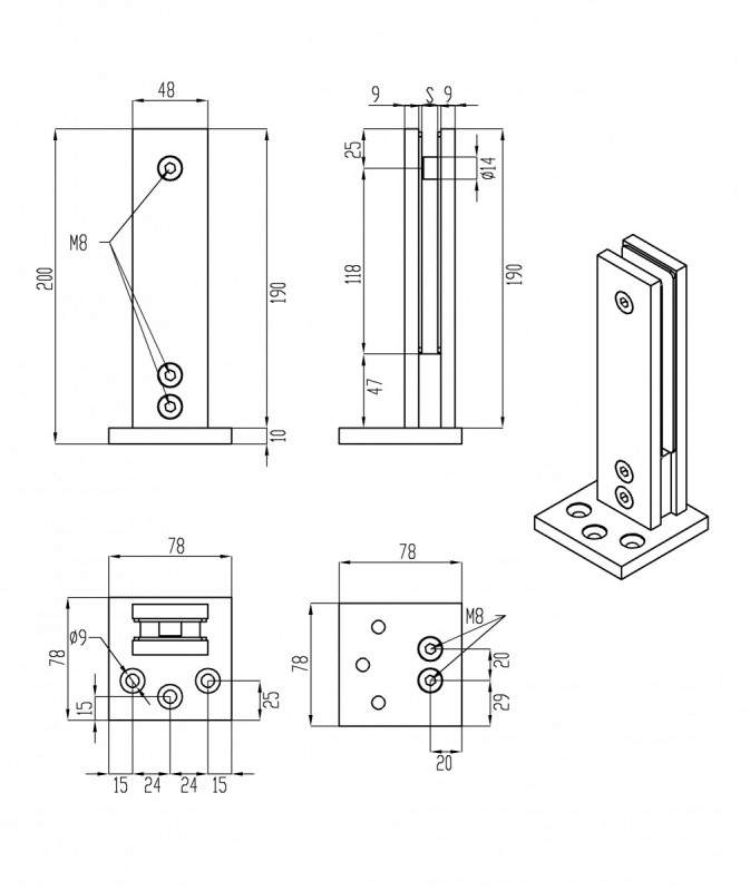 Стеклодержатель Inoxstore, зажимной 48х200, со смещением, сатинированный AISI 304