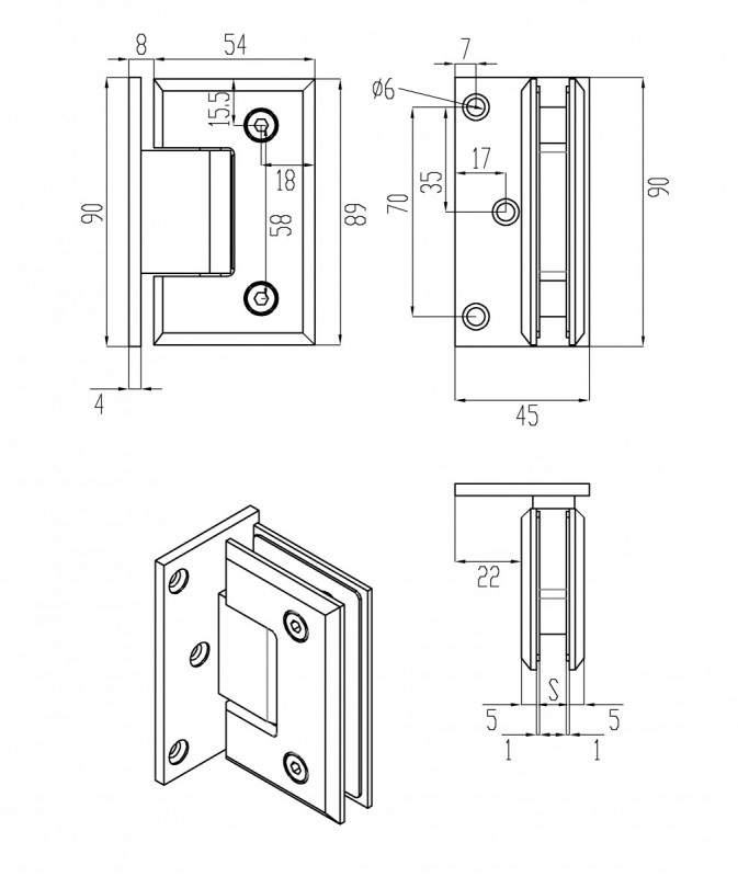 Петля Inoxstore "Элегант" 90° стена-стекло со смещением, с фаской, сатинированная, AISI 304