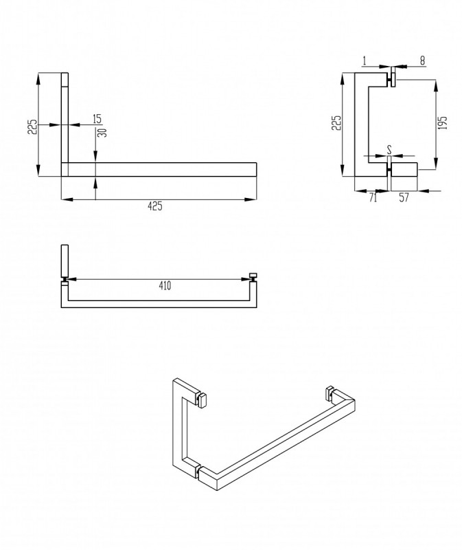 Ручка для душевой кабины 15х30х225х425 мм, сатинированная, AISI 304