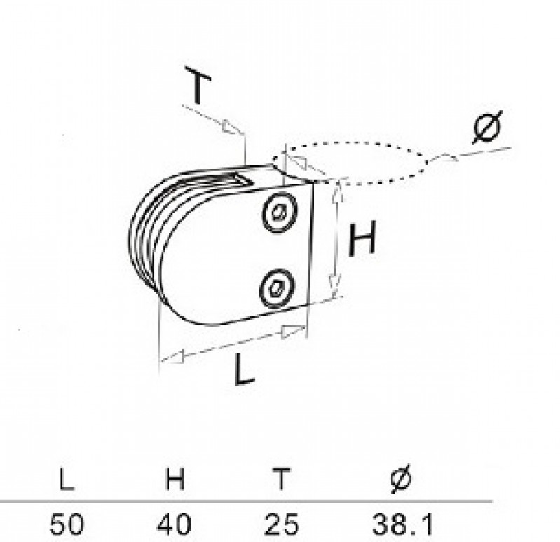 Характеристики Стеклодержатель Inoxstore литой полукруглый 40х50х25 мм / Ø 38,1 мм, под стекло 8 мм, полированный, AISI 304