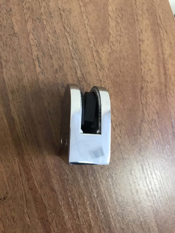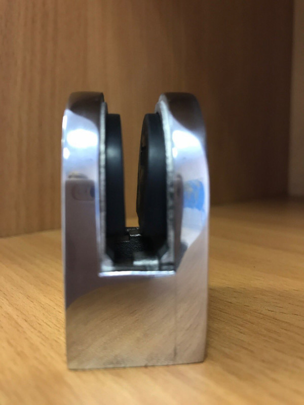 1. Стеклодержатель делим на две части, выкрутив шестигранники. В стойке выполняем отверстие для вытяжной резьбовой заклепки под винт для монтажа кронштейна. Закрепляем деталь стеклодержателя, которая является несущей, к стойке внутрь посредством винта или самореза из нержавейки. Стекло закрепляется посредством установки второй части кронштейна.