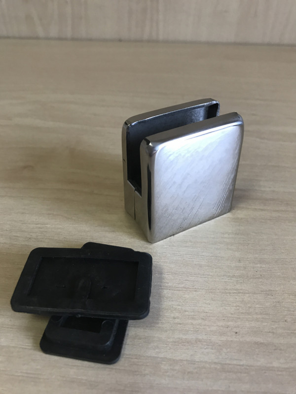Стеклодержатель делим на две части, выкрутив шестигранники. В стойке выполняем отверстие для вытяжной резьбовой заклепки под винт для монтажа кронштейна или приваривают корпус стеклодержателя к внешней стенке трубы стойки. Закрепляем деталь стеклодержателя, которая является несущей, к стойке внутрь посредством винта или самореза из нержавейки. Стекло закрепляется посредством установки второй части кронштейна.