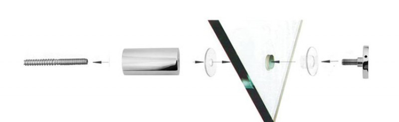 Установка: стеклодержатель приваривают или прикрепляют на саморез, либо винт к стене. А в стекле делают отверстие под шток стеклодержателя. Толщина стекла варьируется в диапазоне от 10 до 12 мм