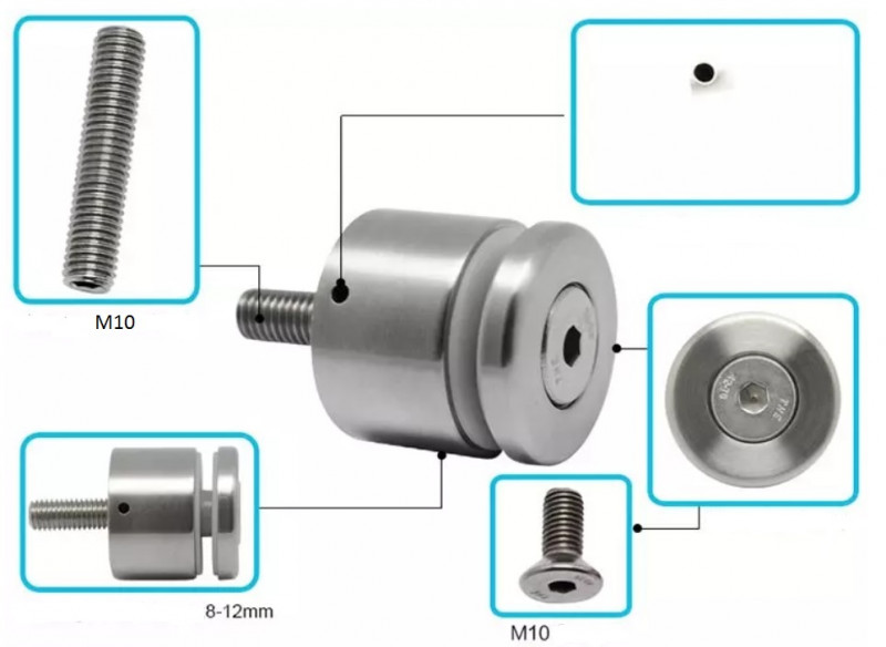 Установка: стеклодержатель приваривают или прикрепляют на саморез, либо винт к стене. А в стекле делают отверстие под шток стеклодержателя. Толщина стекла варьируется в диапазоне от 10 до 12 мм