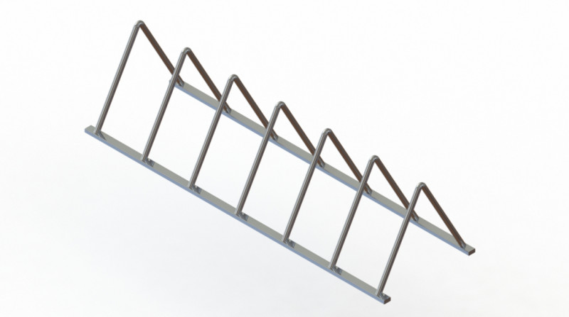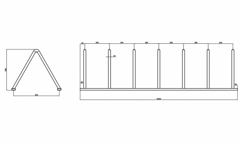 Размеры велопарковки на 6–8 мест компактные: длина изделия 2232 мм, высота 585 мм, ширина 700 мм. Для производства дуг использована труба диаметром 32х1,5 мм. Нижняя часть конструкции изготовлена из профильной трубы сечением 50х25х1,5 мм.